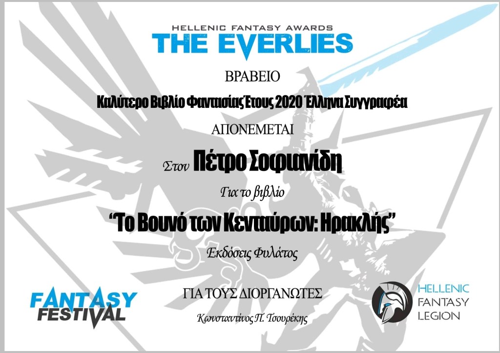 Το πρώτο βιβλίο της τριλογίας μας «Μαίανδρος-Το βουνό των Κενταύρων» του Πέτρου Σοφιανίδη, ψηφίστηκε από το κοινό και βρέθηκε ανάμεσα στους έξι φιναλίστ, από τις συνολικά 64(!) συμμετοχές του διαγωνισμού «The Everlies» Fantasy Festival, στην κατηγορία καλύτερου βιβλίου φαντασίας Έλληνα συγγραφέα, για το έτος 2019.