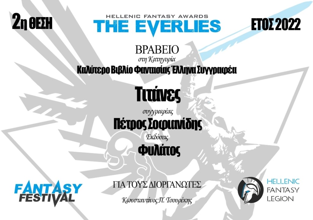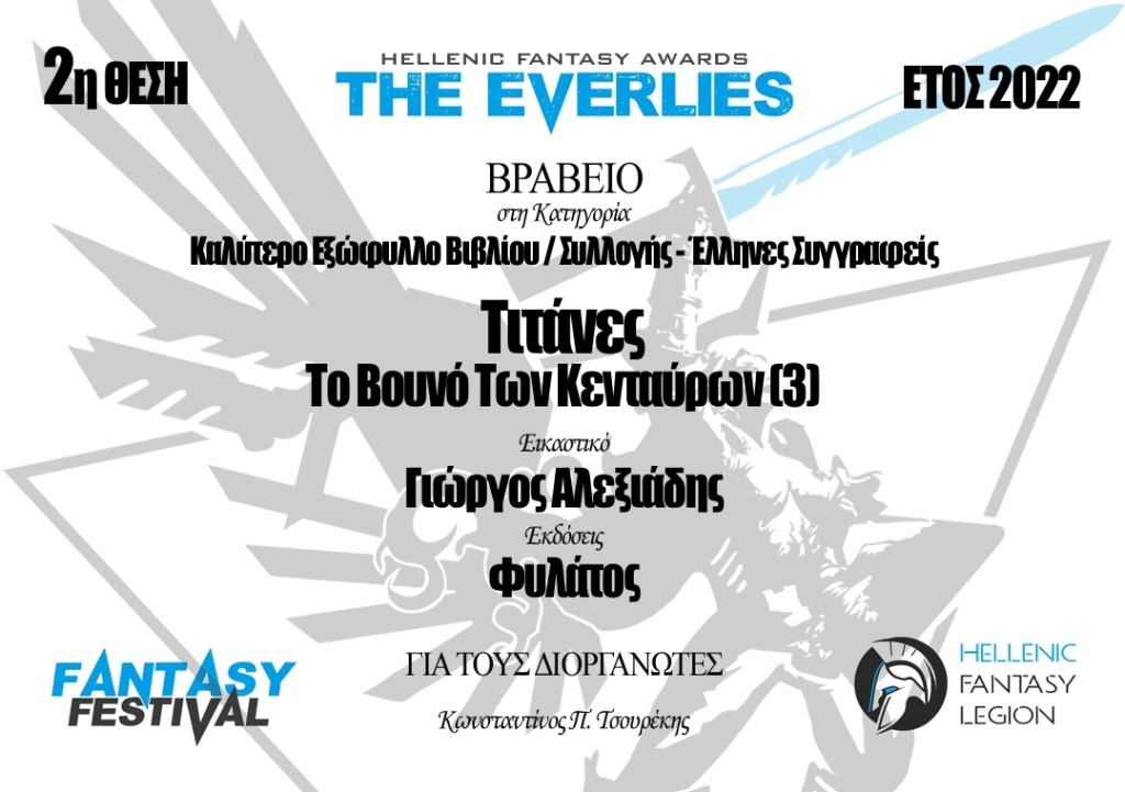 Το τρίτο βιβλίο της τριλογίας μας «Τιτάνες – Το Βουνό των Κενταύρων», έλαβε την 2η θέση σε δυο κατηγορίες, στα βραβεία «Everly» του Fantasy Festival 2K23!